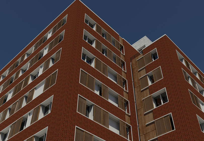 The ground floor contains the building’s entry lobby as well as retail space. The upper floors contain housing units for the students and several faculty members. The penthouse has a library, a media room, an outdoor terrace and an exercise room.