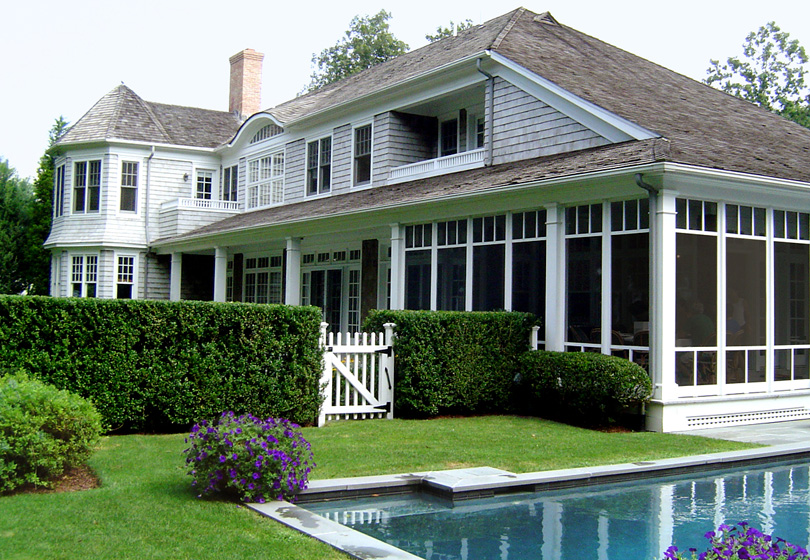 This weekend home is located on a parcel of land facing the water. In order to provide every room with views, the spaces are oriented towards the bay with large window and door openings. Roof overhangs shade the interiors from the summer heat. Halls and ancillary spaces are situated along the east facade while the pool and pool house are placed at the southern end of the property to take full advantage of the sun. Major rooms open directly onto porches allowing the family to enjoy the outdoors throughout the summer. The study and master suite are separated from the entertainment rooms and bedrooms by the stair hall establishing a private zone for the owners. Architecturally, the house respects the shingle style tradition of East Hampton, but it is well insulated and provided with low-e window units.